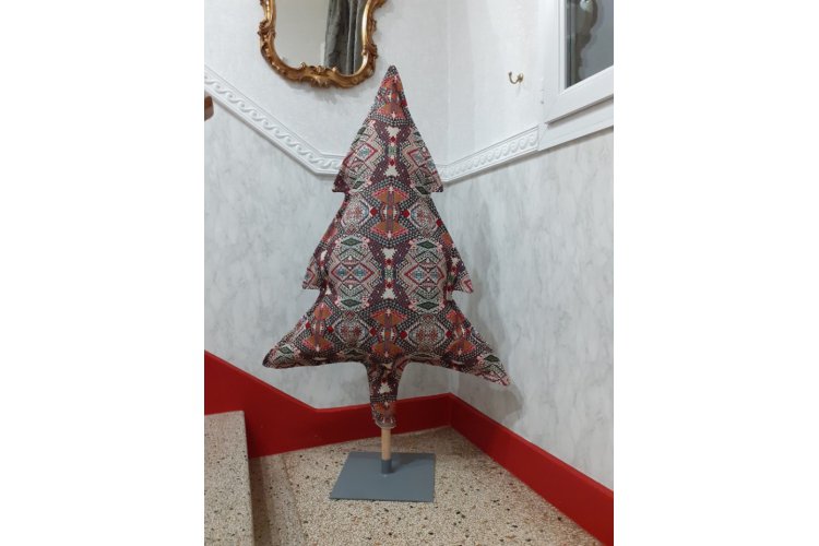 Il vous est proposé deux tailles de sapin (1,10 m ou 60 cm de hauteur) réalisé avec du tissu d'ameublement, rempli de bourre avec un pied en contreplaqué.